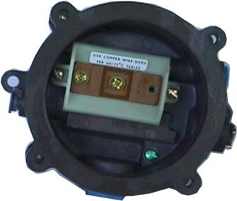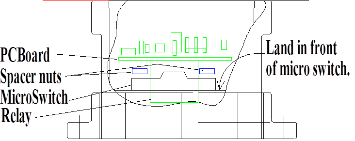 To illustrate construction overview, Fig 3 shows a cross section of the Dwyer pressure switch identifying the spacers and how the circuit board mounts on the MicroSwitch. The PC board and its components are shown in Green and the spacer nuts are blue. The original relay’s 3-hole SPDT contact pinout was modified by drilling two holes in the PC board to fit the 4-hole DPDT contact configuration. Two jumpers were added on the PC board to connect the DPDT contacts in parallel to use both sets. The new power relay physically fits inside the pressure switch housing and still meets the electrical requirements. |