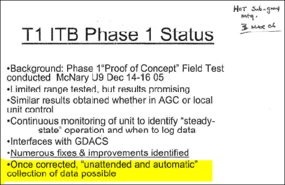 This second slide reports on the testing at Ice Harbor Dam in February, 2006. This second “proof of concept” test showed that the ITB performed as advertised again, and this time the software bugs had been corrected. It went on to state that the test “Results [were] virtually identical to those obtained using COE data acq system” and that my ITB was ‘Ready for “unattended, automated” data collection’. Applicability for use with Francis type hydroelectric turbines was also indicated.